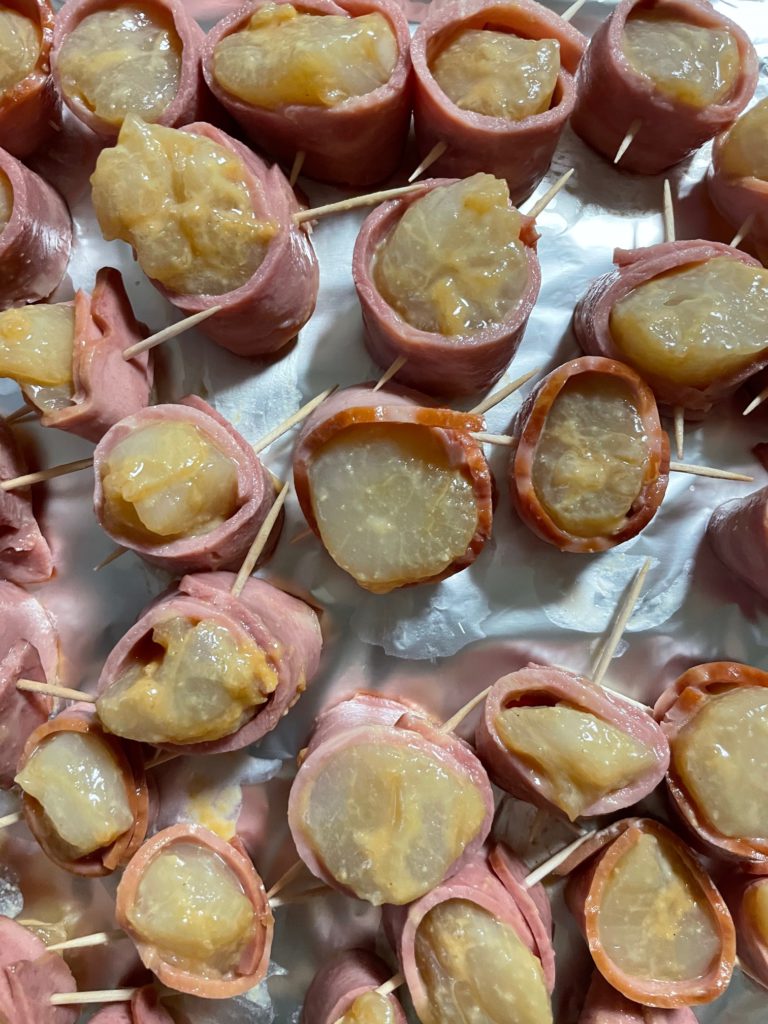 - Wrap-将培根切成小条纹,以适合包裹扇贝。将一块培根包在扇贝周围然后用牙签固定