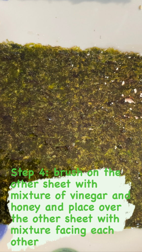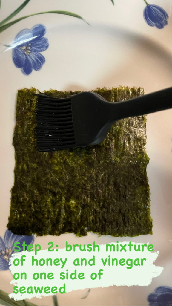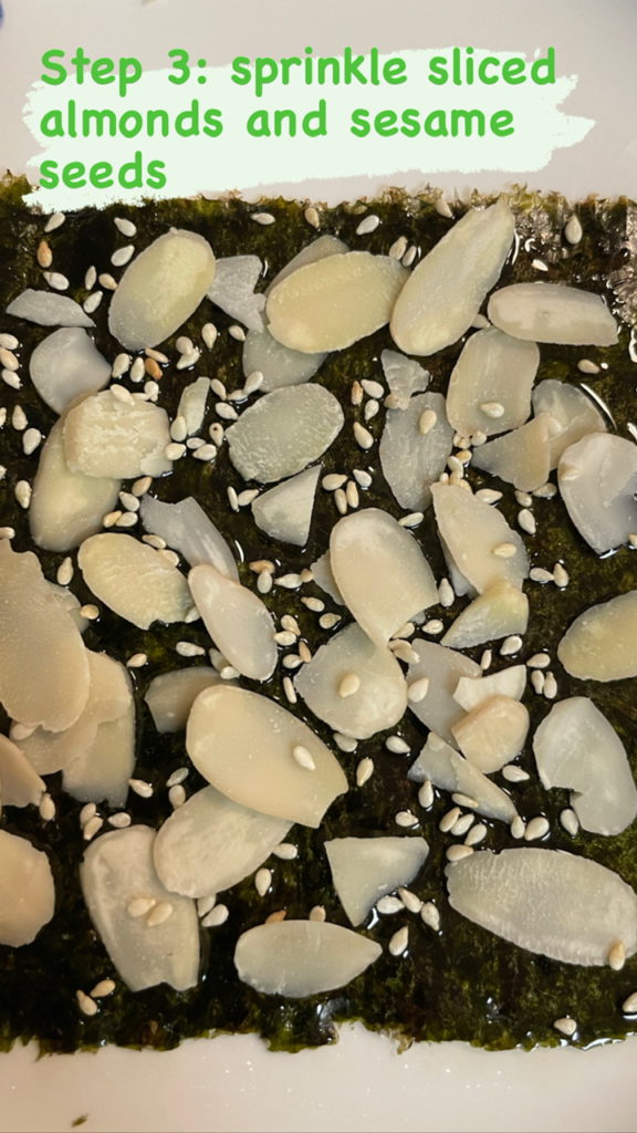 - Sprinkle sliced almond and sesame seed on top of the brushed seaweed.